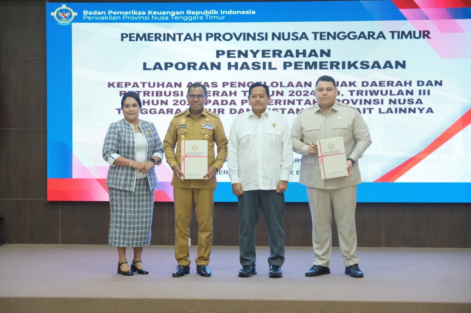 KUPANG – Badan Pemeriksa Keuangan Republik Indonesia (BPK RI) Perwakilan Provinsi Nusa Tenggara Timur menyerahkan Laporan Hasil Pemeriksaan (LHP) Kepatuhan atas Pengelolaan Pajak Daerah dan Retribusi Daerah (PDRD) Tahun 2024 hingga Triwulan III Tahun 2025 kepada Pemerintah Provinsi NTT dan instansi terkait. Kegiatan tersebut berlangsung di Aula Kantor BPK Perwakilan Provinsi NTT, Senin (12/1/2026) sore.