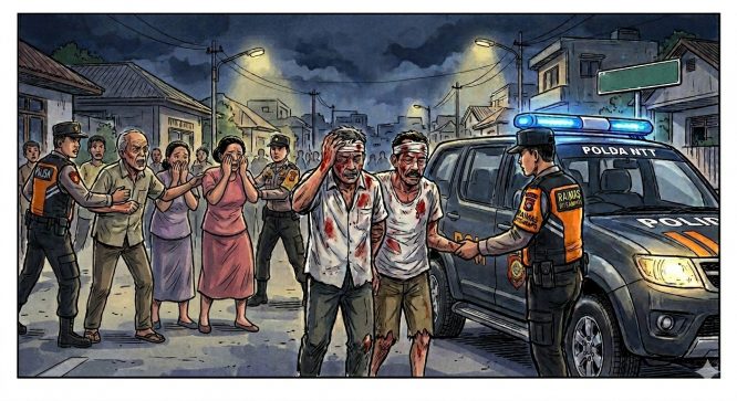 Tim Patroli Perintis Presisi dari Polda Nusa Tenggara Timur yang dipimpin Danton Raimas Ditsamapta, Dickson Hermanus Lay, bersama piket Provos Bid Propam Polda NTT segera menuju tempat kejadian perkara setelah menerima laporan adanya aksi penganiayaan.