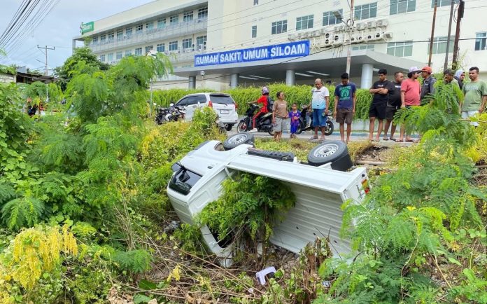 KUPANG – Kecelakaan lalu lintas terjadi di depan Rumah Sakit Siloam Kupang, Rabu (25/2/2026) sekitar pukul 13.50 WITA. Sebuah mobil Suzuki Carry pikap berwarna putih dengan nomor polisi DH 8023 AT terbalik dan terjun ke jurang sedalam kurang lebih dua meter setelah diduga disenggol kendaraan lain.