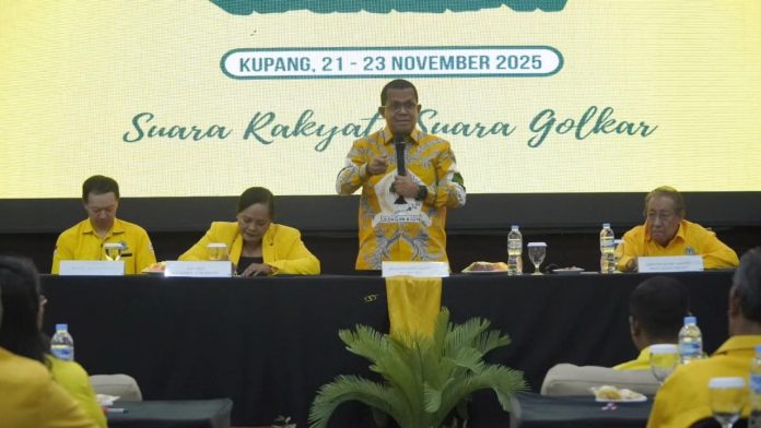 KUPANG – DPD I Partai Golkar Provinsi Nusa Tenggara Timur resmi membuka Golkar Academy Angkatan IV di Hotel Said Timore, Kupang, Jumat (21/11/2025). Kegiatan pelatihan intensif selama dua hari itu dibuka langsung oleh Wakil Ketua Umum DPP Partai Golkar sekaligus Ketua DPD I Golkar NTT, Emanuel Melkiades Laka Lena, dan dihadiri Dewan Pembina, Sekretaris DPD I Golkar NTT Welhelmintje S. L. Sinlaeloe, para ketua DPD II se-NTT, anggota fraksi provinsi dan kabupaten/kota, serta peserta non-fraksi. Total 80 anggota fraksi kabupaten/kota dan 9 anggota DPRD provinsi ikut serta dalam agenda peningkatan kapasitas tersebut.
