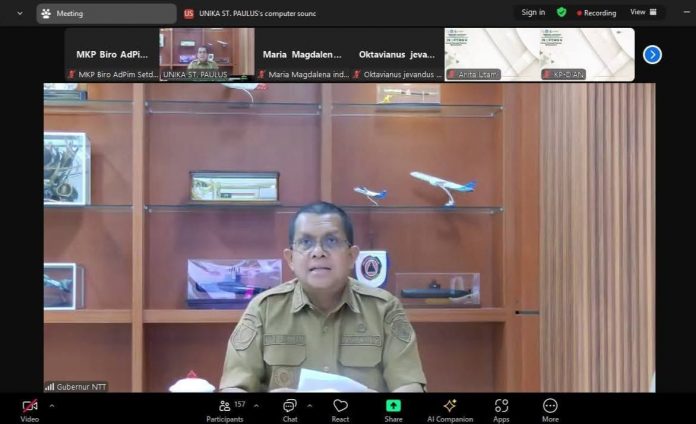 KUPANG – Gubernur Nusa Tenggara Timur (NTT), Emanuel Melkiades Laka Lena, menghadiri secara daring Seminar Nasional INOPTAN IV (Inovasi Teknologi Pertanian Berkelanjutan) yang mengusung tema “Optimalisasi Sumber Daya Lokal Melalui Digitalisasi untuk Ketahanan Pangan”. Kegiatan ini diselenggarakan oleh Fakultas Pertanian dan Peternakan Universitas Katolik Indonesia Santo Paulus Ruteng, Senin (19/1/2026).