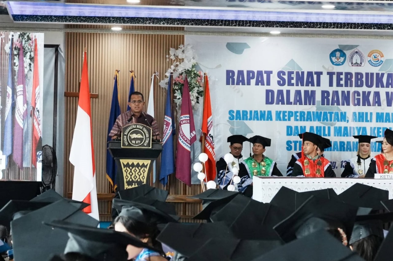 KUPANG – Gubernur Nusa Tenggara Timur (NTT), Emanuel Melkiades Laka Lena, menghadiri Rapat Senat Luar Biasa dalam rangka Wisuda Sarjana Keperawatan, Ahli Madya Keperawatan, dan Ahli Madya Kebidanan STIKES Maranatha Kupang, Sabtu (13/12/2025). Kegiatan tersebut berlangsung di Aula Kampus STIKES Maranatha Kupang.