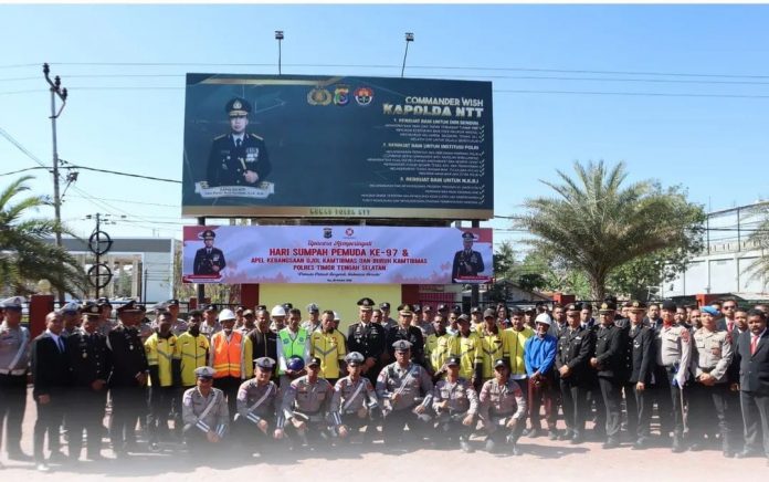 SOE, TTS – Kapolres Timor Tengah Selatan (TTS), AKBP Hendra Dorizen, S.H., S.I.K., M.H., memimpin Apel Kebangsaan Ojek Online (Ojol) Kamtibmas dan Buruh Kamtibmas Polres TTS yang digelar di halaman Mapolres TTS, Selasa (28/10/2025) pagi, sekitar pukul 08.15 WITA.