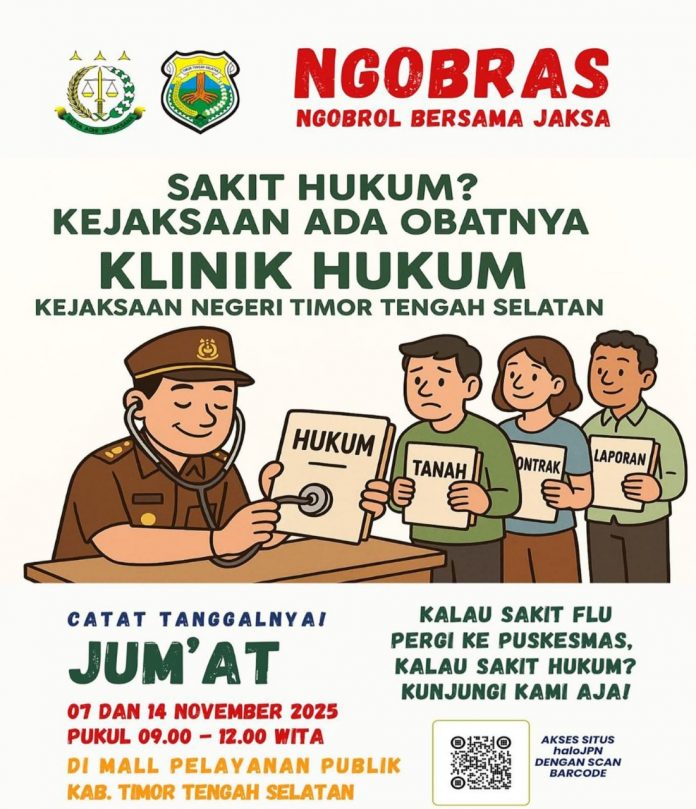 SOE, TTS – Kejaksaan Negeri Timor Tengah Selatan (TTS) membuka layanan Klinik Hukum Gratis bagi masyarakat di Mal Pelayanan Publik (MPP) Kabupaten TTS pada 7 dan 14 November 2025, mulai pukul 09.00 hingga 14.00 WITA.