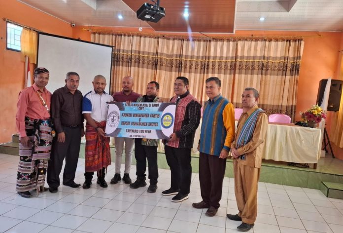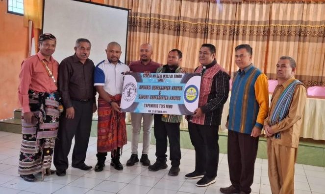 SOE, TTS – Ketua Sinode Gereja Masehi Injili di Timor (GMIT), Pdt. Samuel Benyamin Pandie, S.Th, menyerahkan secara simbolis Aplikasi Pendidikan dan Rapor Berkarakter Kristus kepada 104 sekolah di bawah naungan Yayasan Pendidikan Kristen (Yapenkris) To’isneno, Selasa (21/10/2025), di SMK Kristen Soe.