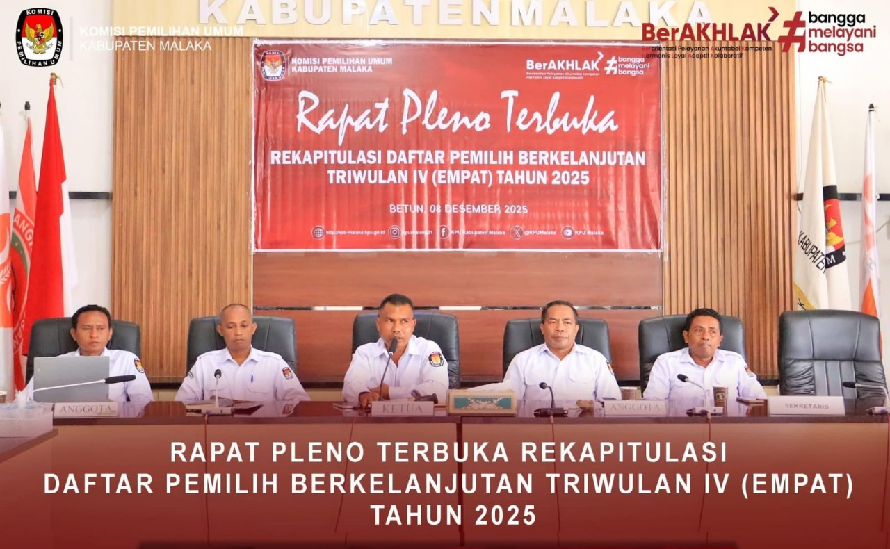 MALAKA – Komisi Pemilihan Umum (KPU) Kabupaten Malaka menggelar Rapat Pleno Pemutakhiran Daftar Pemilih Berkelanjutan (PDPB) Triwulan IV Tahun 2025 di Aula Kantor KPU Malaka, Senin (08/12/2025). Agenda ini menjadi langkah krusial untuk memastikan daftar pemilih di Kabupaten Malaka tetap akurat, mutakhir, dan inklusif menjelang tahapan pemilu mendatang.