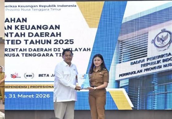 KUPANG – Wakil Bupati Kupang Aurum Titu Eki menyerahkan Laporan Keuangan Pemerintah Daerah (LKPD) Unaudited Tahun Anggaran 2025 kepada Badan Pemeriksa Keuangan Republik Indonesia Perwakilan Nusa Tenggara Timur, Selasa (31/3/2026).