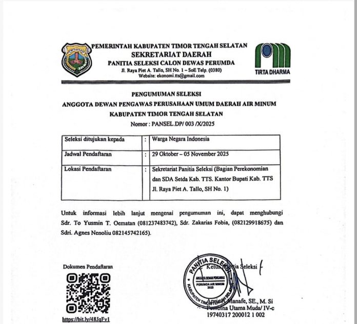 Pengumuman resmi bernomor PANSEL.DP/003/X/2025 itu dikeluarkan oleh Panitia Seleksi Calon Dewas Perumda yang berkedudukan di Sekretariat Daerah Kabupaten TTS, dan ditandatangani oleh Ketua Panitia Seleksi, Apris Manafe, SE., M.Si.
