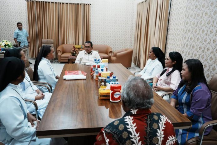 KUPANG — Jajaran Suster Religious of the Virgin Mary (RVM) Distrik Indonesia bersama perwakilan SDK Yaswari Niki-Niki, Kecamatan Amanuban Tengah, Kabupaten Timor Tengah Selatan (TTS), melakukan audiensi dengan Gubernur Nusa Tenggara Timur, Emanuel Melkiades Laka Lena, di Rumah Jabatan Gubernur NTT, Minggu (4/1/2026) sore.