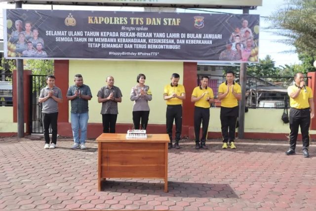 SOE – Kepolisian Resor (Polres) Timor Tengah Selatan (TTS) menggelar syukuran sederhana namun penuh kebersamaan untuk merayakan ulang tahun personel yang lahir pada periode Januari 2026. Kegiatan yang dipimpin langsung Kapolres TTS AKBP Hendra Dorizen, S.H., S.I.K., M.H., ini berlangsung di halaman apel Mapolres TTS, Jumat (6/2/2026).