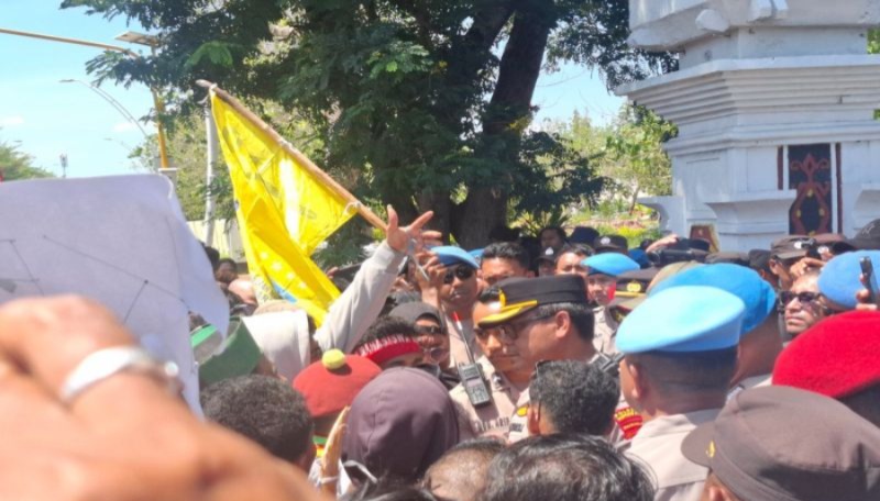 Tak berselang lama, Kapolres masuk ke gedung dan kembali dengan membawa tiga pejabat yang diminta. Gubernur NTT Melki Laka Lena, Ketua DPRD Emilia Nomleni, serta Kapolda NTT Irjen Pol Rudi Darmoko akhirnya menemui massa untuk berdialog di depan pintu masuk gedung DPRD.