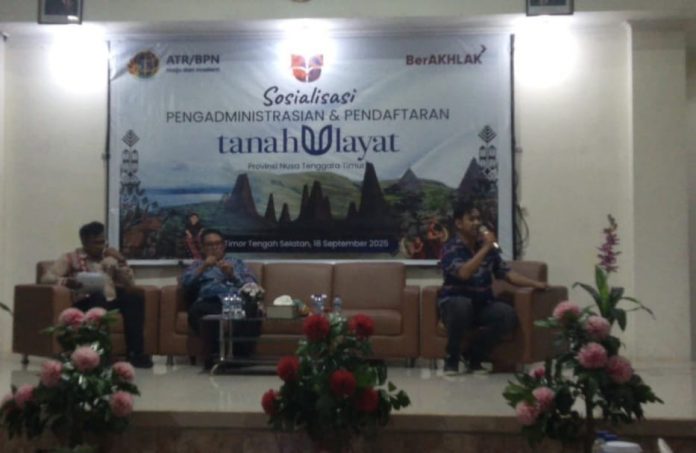 SOE, TTS — Upaya melindungi hak masyarakat hukum adat terus diperkuat. Kementerian Agraria dan Tata Ruang/Badan Pertanahan Nasional (ATR/BPN) menargetkan pada 2025 tanah ulayat milik Suku Boti sudah teradministrasi dan terdaftar resmi di Kantor Pertanahan Kabupaten Timor Tengah Selatan (TTS). Sebagai langkah awal, Kamis (18/9/2025), digelar sosialisasi pengadministrasian dan pendaftaran tanah ulayat di Aula Mutis, Kantor Bupati TTS.